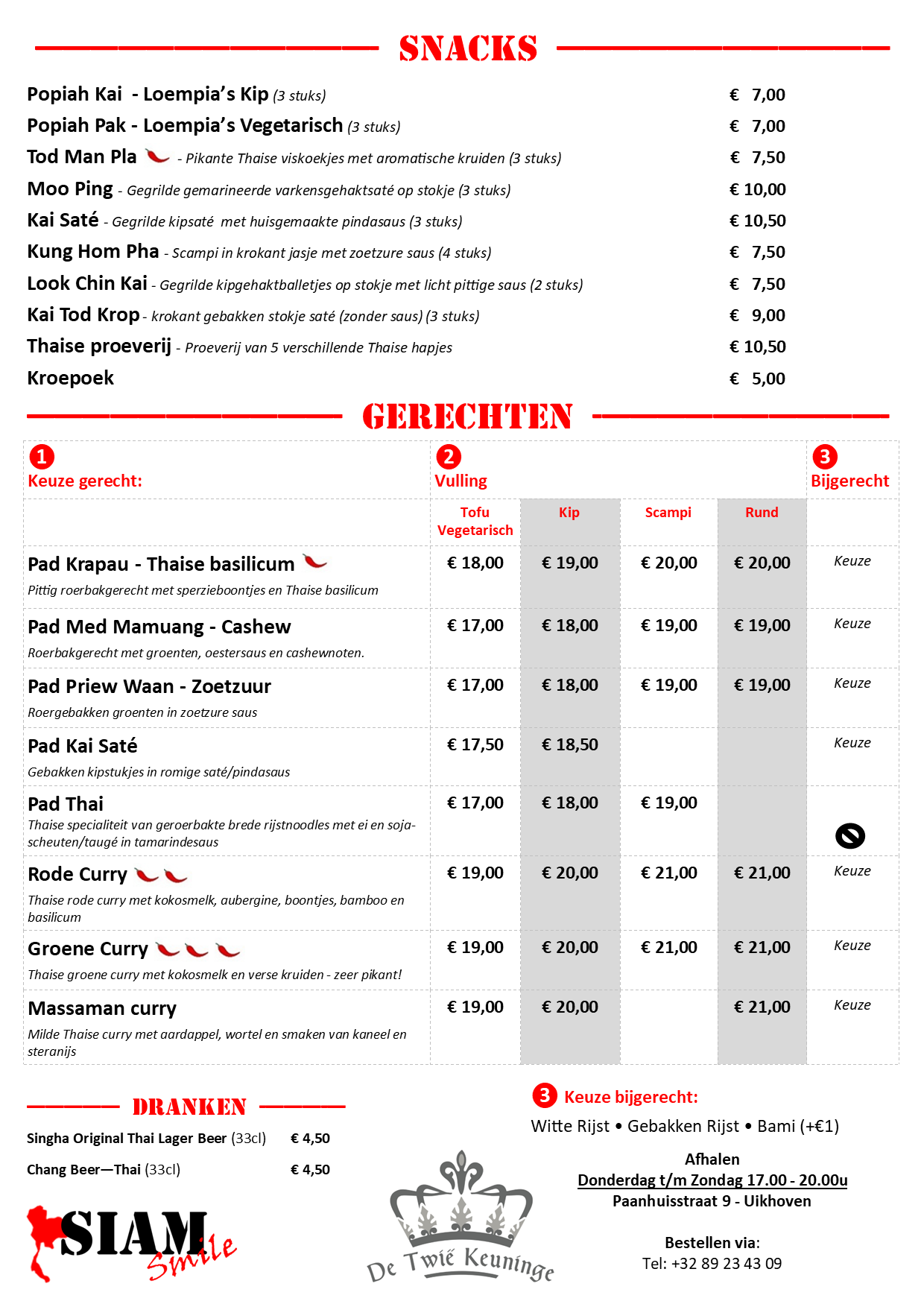 Onze afhaal gerechten kunnen iedere donderdag t/m zondag worden besteld voor afhaal tussen 17u-20u voor het afhalen van heerlijk authentieke Thaise afhaalmaaltijden.